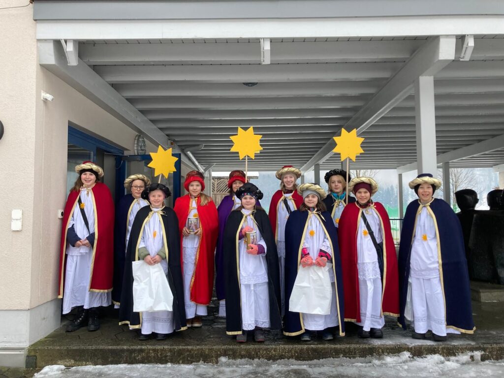Die Sternsingerkinder wurden im Gottesdienst ausgesandt, um zu den Menschen in allen Häusern der Pfarrei aufzubrechen. «Wir kommen daher aus dem Morgenland, wir kommen geführt von Gottes Hand» wurde vor vielen Haustüren gesungen und der Segen auf die Tür geklebt. Die 31 Kinder der Klasse 5 a und b pflegten diesen Brauch trotz Föhnsturm mit viel Freude – einem König wehte der Föhn die Krone vom Kopf und diese landete schlussendlich in der Muota. Ein grosses Dankeschön und ein herzliches «Vergelt’s Gott» an alle Sternsinger für den unermüdlichen Einsatz und an unsere Pfarreimitglieder für die grosszügigen Spenden – wir durften Fr. 5‘769.30 entgegennehmen.